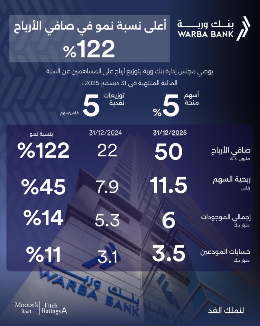 بنك وربة: 122 % نمواً في صافي الأرباح